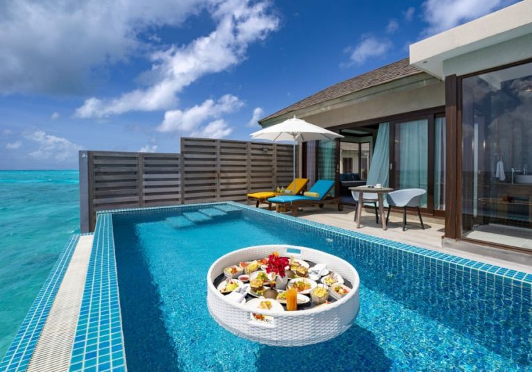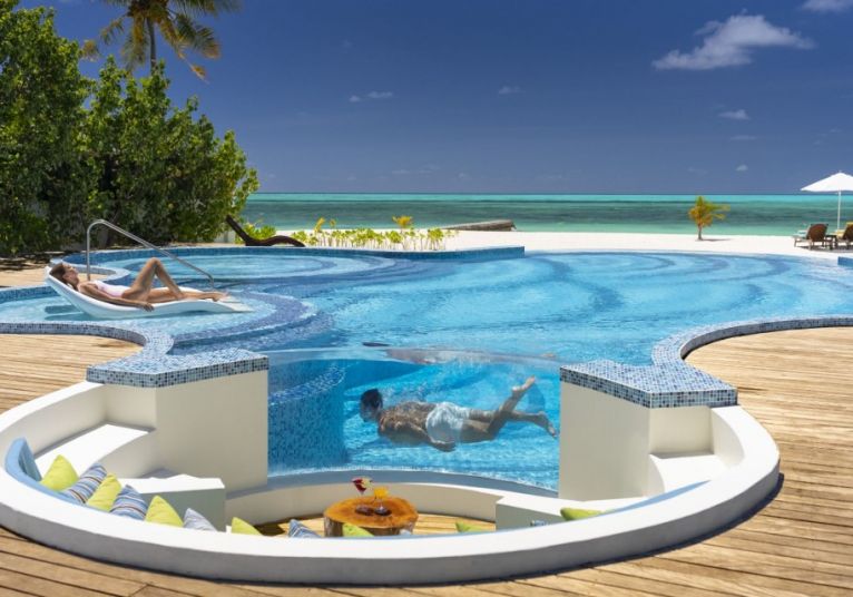 Потопете се в луксозно островно бягство в плажни вили с басейн. Насладете се на гледка към лазурната лагуна на остров Канифуши от леглото си. За 2 възрастни и 2 деца или 3 възрастни и 1 дете, с 1 легло Queen, площ 194 м², басейн 36 м².