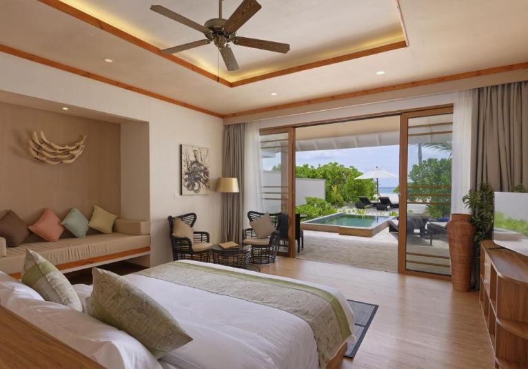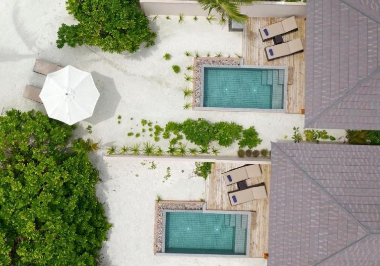 30 Beach Pool Villas, разположени близо до брега на острова, предлагат директен достъп до белия пясъчен плаж на Brennia и зашеметяваща гледка към океана.
