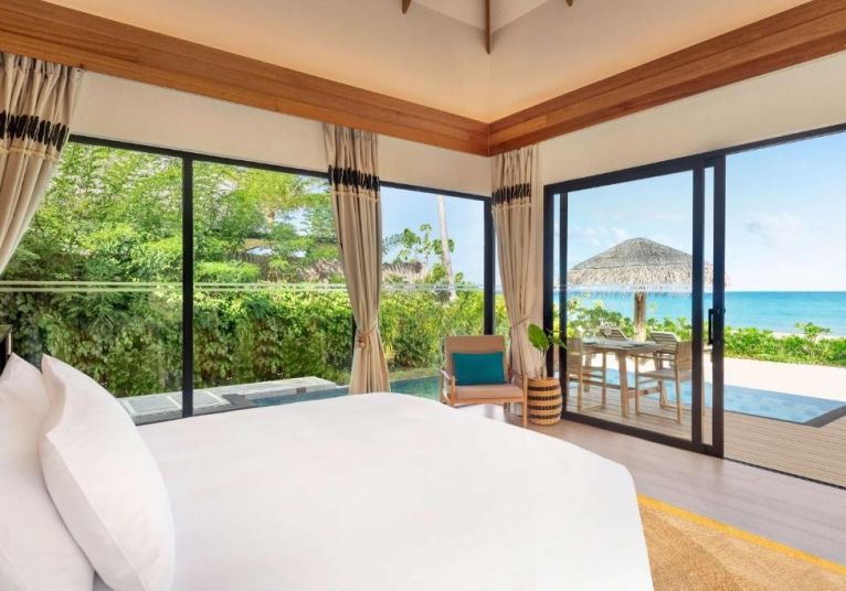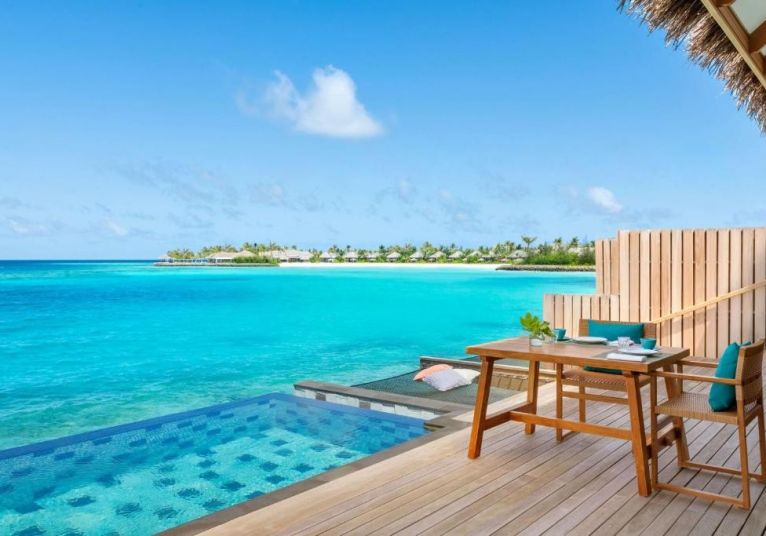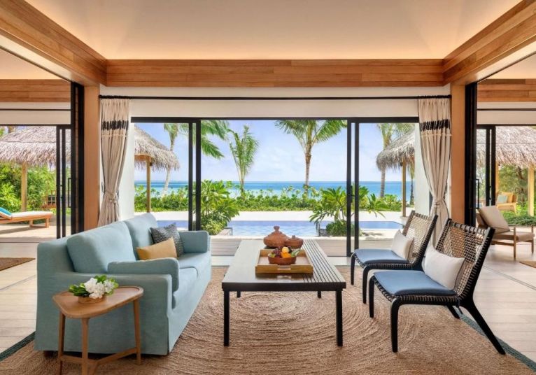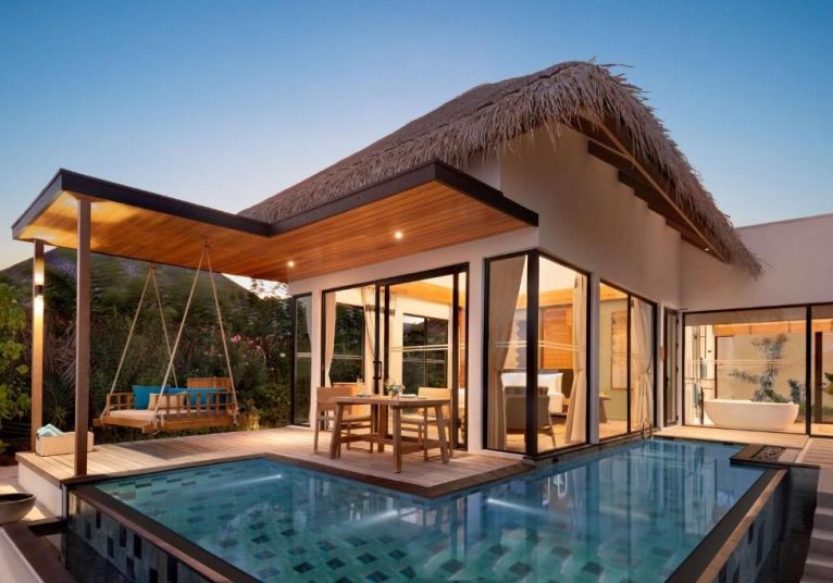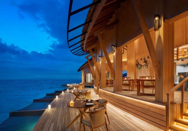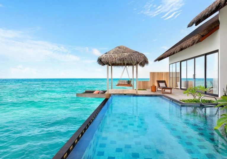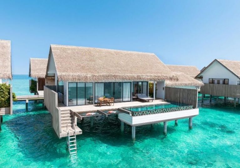 Просторна вила от 338 кв.м над водата с директен достъп до океана, две king size легла, отделна всекидневна, частен басейн, външна тераса с трапезария, хамак, люлка и шезлонги, Wi-Fi, 55'' телевизор, минибар и две бани с външни душове, подходяща за до 6 гости с две допълнителни легла.