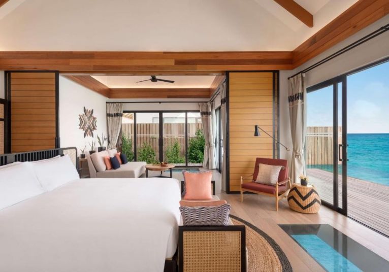 Вила от 181 кв.м над водата с директен достъп до океана, частен басейн, просторен хол с дневна зона, стъклени панели в пода за гледка към водата, външна тераса с трапезария, хамак и шезлонги, легло king size, Wi-Fi, 55'' телевизор, минибар и баня с външен душ, подходяща за до 4 гости с допълнително легло.