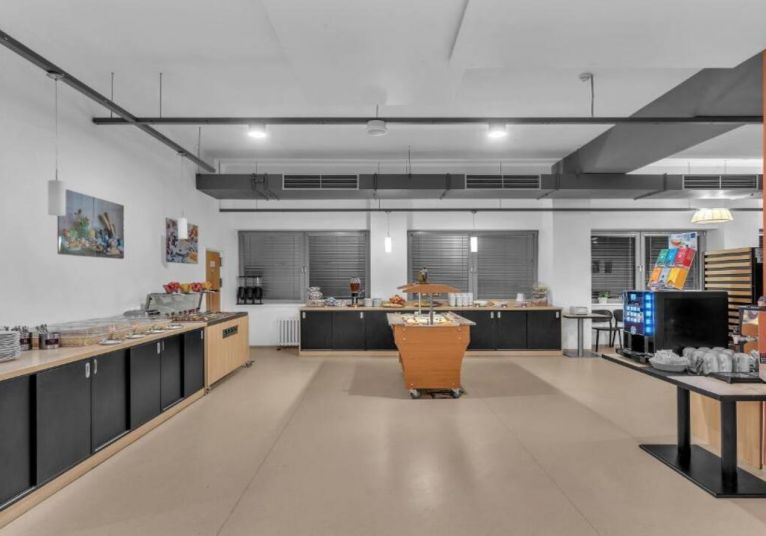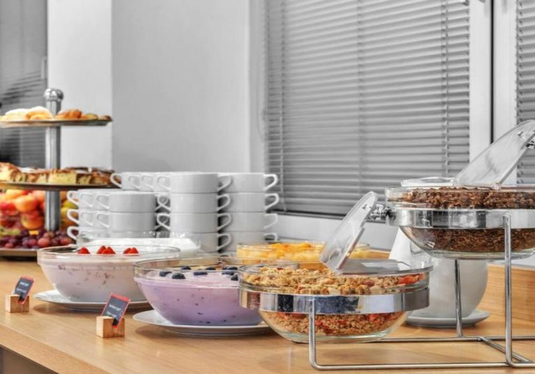 Хотелът разполага със светла зала за закуска, където се предлага континентална закуска на блок-маса – хляб, масло, конфитюр, зърнени храни, колбаси, сирена, плодове, кафе, чай и сокове