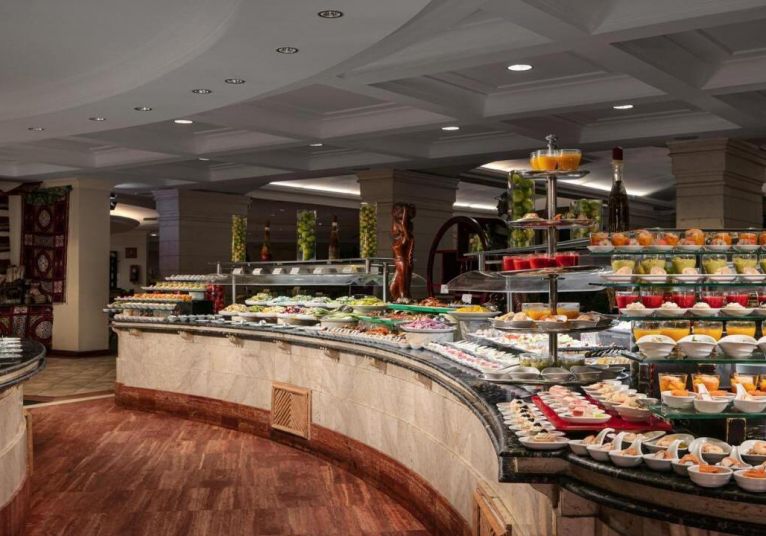 Основният ресторант предлага закуска, обяд и вечеря на блок маса с интернационална кухня. Хотелът разполага и с няколко а ла карт ресторанта – гръцки, италиански, азиатски и ориенталски. Предварителна резервация е необходима за а ла карт ресторантите. Баровете в комплекса предлагат богато разнообразие от напитки и леки закуски през деня.