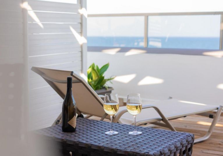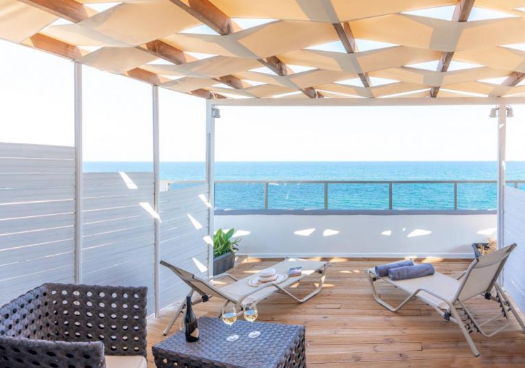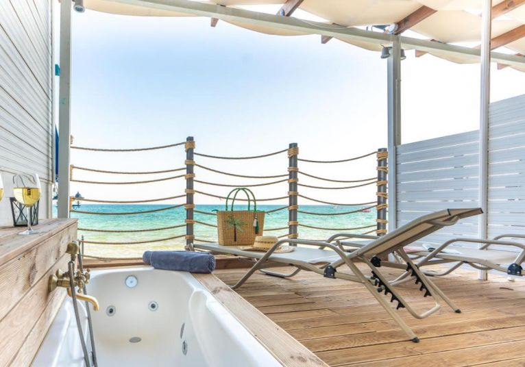 Двойна стая seafront - Построени са точно пред морето с неблокиран изглед към залива Термаикос. Разполагат с голям балкон с градински мебели и собствено джакузи за уникални моменти на релакс до морето. Разполагат с 2 единични легла. (25 m 2 )