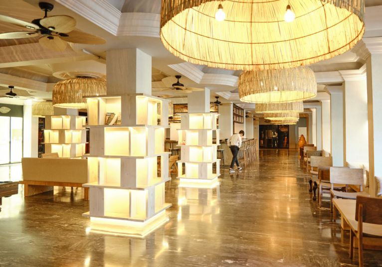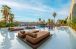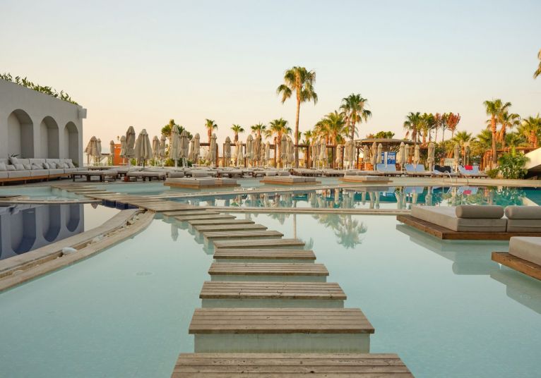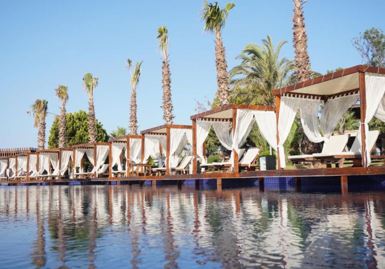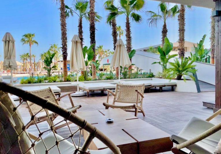 Собствен,, пясъчен сдължина 100 м. и платформа, на която е разположен Mocha Beach Club с кабани (срещу заплащане). Чадъри, шезлонги и плажни кърпи на плажа и при басейна -безплатно.