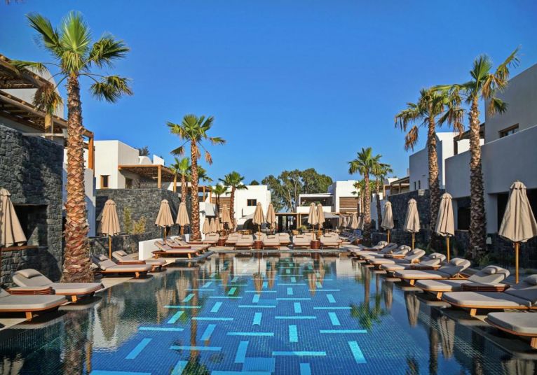 Премиум стая с тераса и самостояетелен плувен басейн - 26 кв.м. - Тази стая предлага извити елементи и минималистичен дизайн, вдъхновен от цикладската архитектура на острова и разполага с едно голямо или две единични легла, тераса със самостоятелен басейн и отлична гама от удобства в стаята, включително кафемашина Nespresso и телевизор.