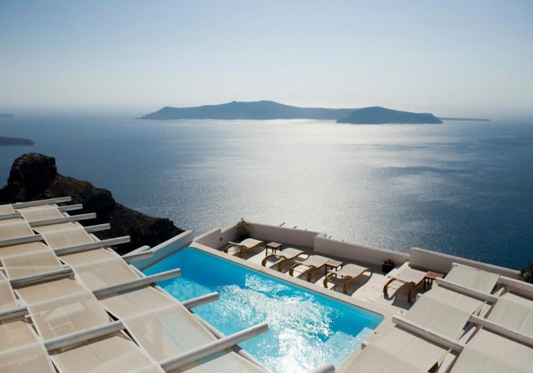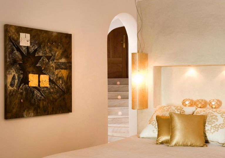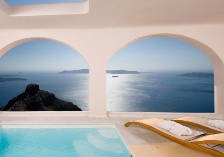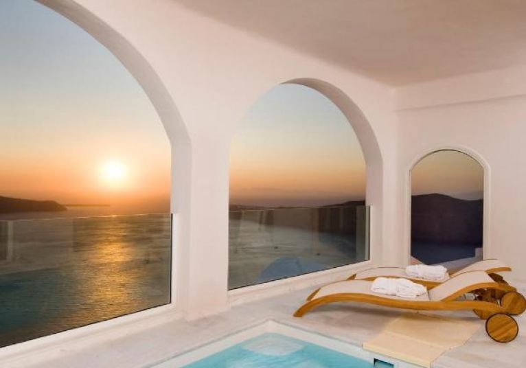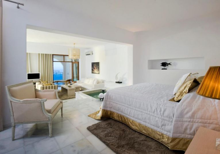 Климатик, телевизор, телефон, сейф в стаята, сешоар, халати и чехли, тоалетни принадлежности Apivita (гръцка натурална козметика), Мини бар Nespresso безплатно кафе, Безплатен WI-Fi 2, собствена веранда с гледка към калдерата и външен отопляем басейн, рум сервиз. Размер 50 кв. м.