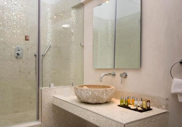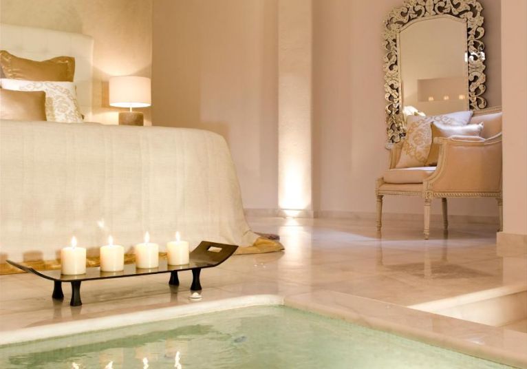 Климатик, телевизор, телефон, сейф в стаята, сешоар, халати и чехли, тоалетни принадлежности Apivita (гръцка натурална козметика), Мини бар Nespresso безплатно кафе, Безплатен WI-Fi 2, собствена веранда с гледка към калдерата и външен отопляем басейн, хамам, рум сервиз. Размер 80 кв. м.