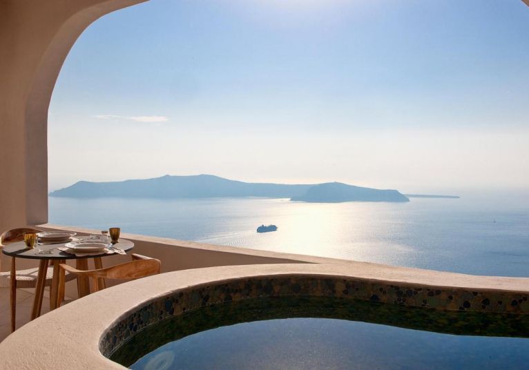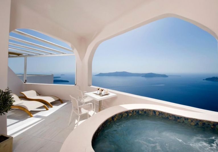 Климатик, телевизор, телефон, сейф в стаята, сешоар, халати и чехли, тоалетни принадлежности Apivita (гръцка натурална козметика), Мини бар Nespresso безплатно кафе, Безплатен WI-Fi, собствена веранда с гледка към калдерата и външно отопляемо джакузи, рум сервиз. Размер 45 кв. м.
