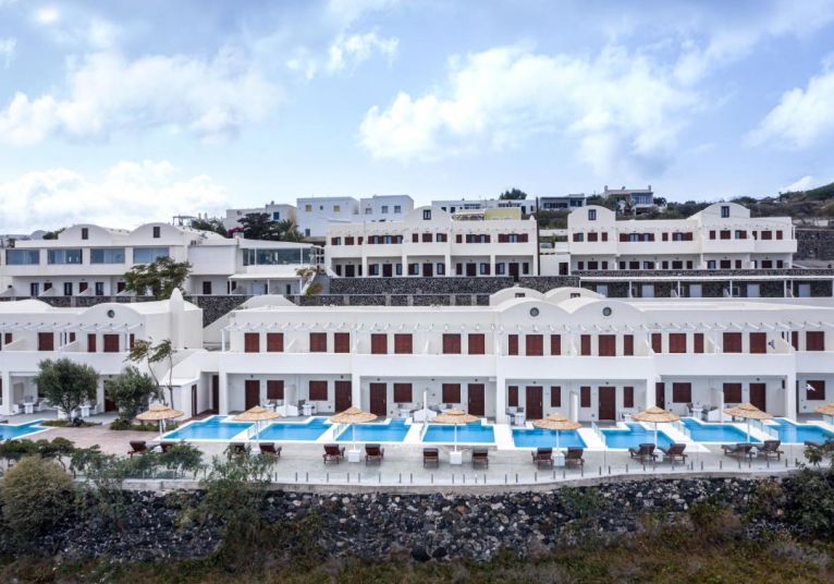 Хотелът се намира на 7 км от летището, на 12 км. от селището Иа, на 9 км. от пристанището, в живописния Фиростефани, на пешеходно разстояние от центъра на столицата Фира. Хотелски комплекс Splendour Resort предлага елегантни 5-звездни помещения за настаняване с изглед към Егейско море.
