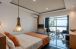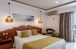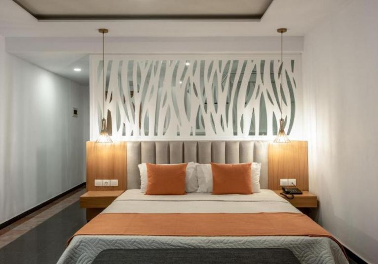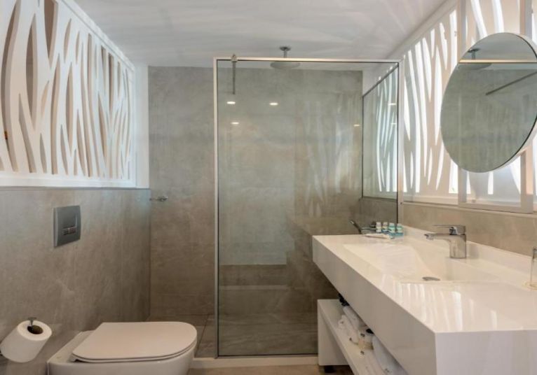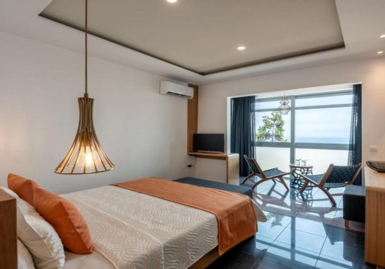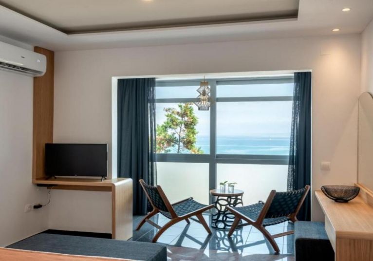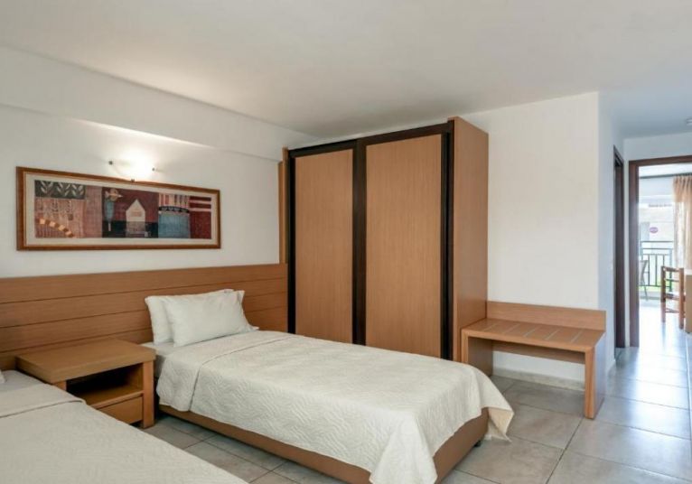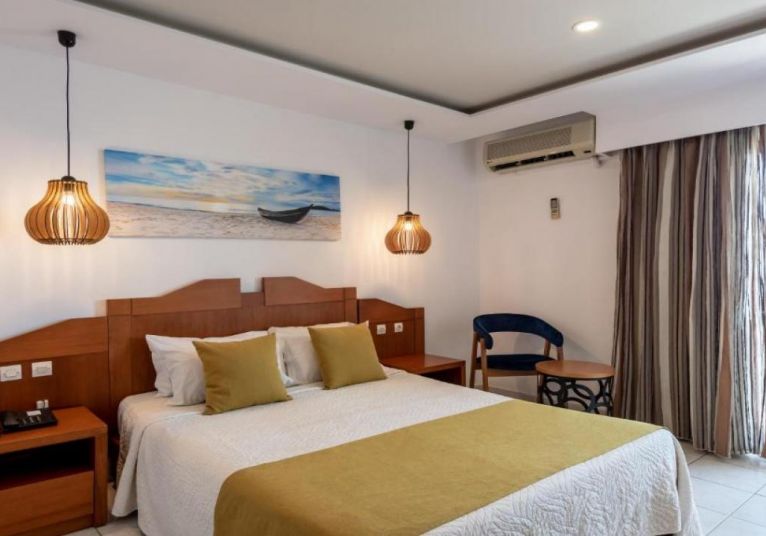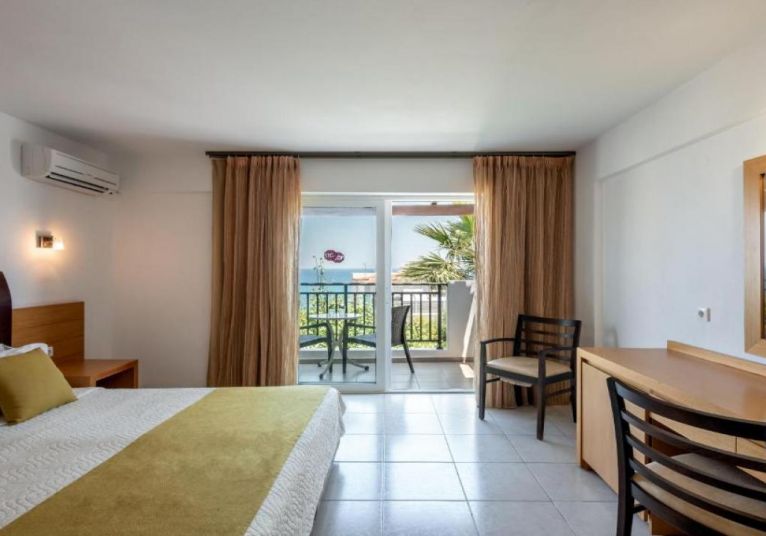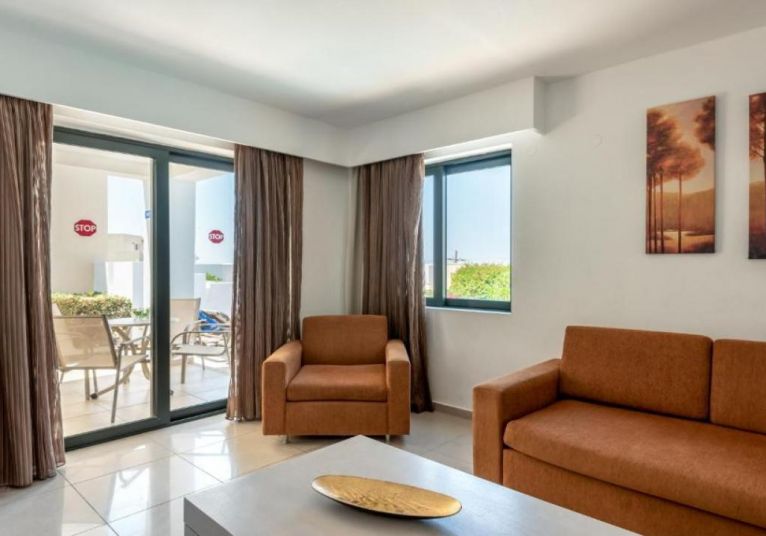Стаите и суитите са оборудвани с климатик, сателитна телевизия и хладилник. Някои стаи са с директен достъп до общ басейн. Мезонетите включват собствен басейн с хирдомасжна вана.Всички помещения за настаняване имат балкон или тераса с изглед към Критско море или градините на хотела.