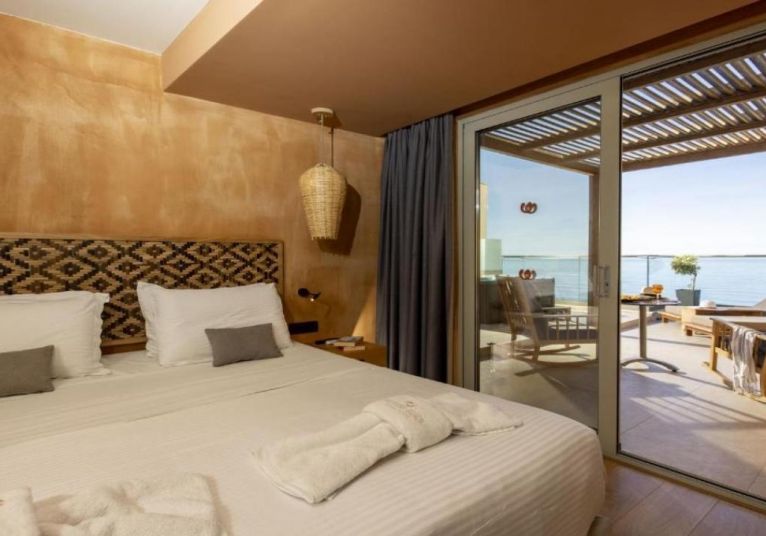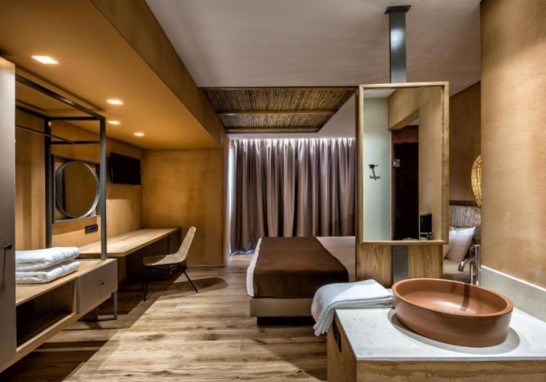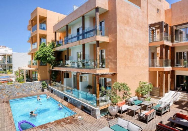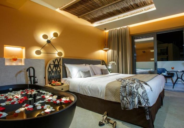 Стаите и суитите са оборудвани с климатик, сателитна телевизия и хладилник. Някои стаи са с директен достъп до общ басейн. Мезонетите включват собствен басейн с хирдомасжна вана.Всички помещения за настаняване имат балкон или тераса с изглед към Критско море или градините на хотела.
