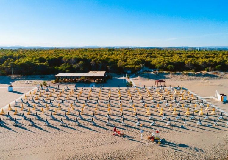 Плажът е част от комплекса с безплатни чадъри и шезлонги за клиентите. За да го достигнете, преминавате през прекрасна романтична зелена борова гора по обособени пътеки, или с минибусчета, които се движат през целия ден. Плажът е дълъг и широк, с фин пясък и безплатни чадъри и шезлонги.