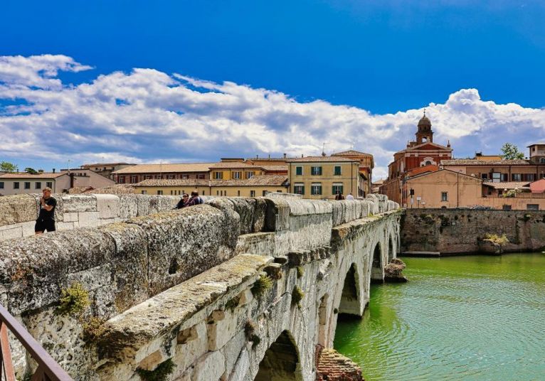 Пешеходна разходка в историческия център на Римини. Разглеждане на Арката на Октавиан Август,Старата часовникова кула, катедралната църква „Малатеста”, изграденa в средата на 15 в. като погребална църква на управляващата фамилия Малатеста,