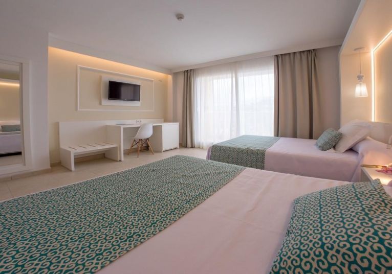 Семейства с деца — големи стаи с две големи легла, детски клуб, анимация и плитък пясъчен плаж пред хотела.