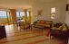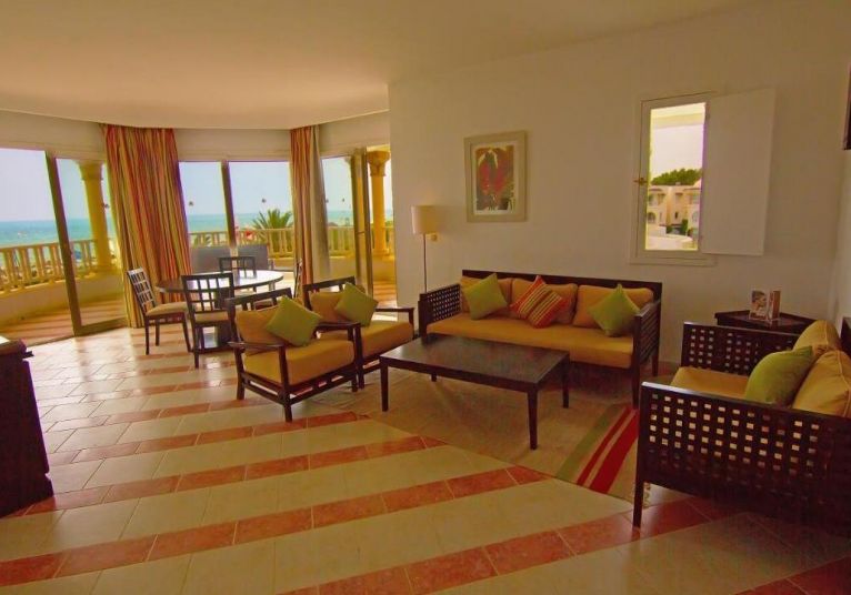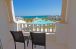 Джуниър суит с морски изглед: С площ 38 кв. м. и капацитет до 2 възрастни + 1 дете. Представлява едно помещение със спалня, просторен кът за сядане с диван, маса столове, и голяма тераса с гледка към морето.