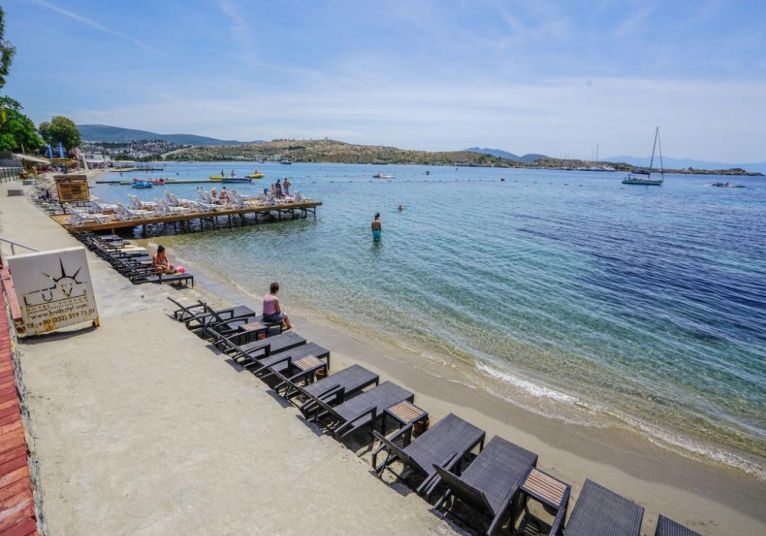 Собствен, пясъчно - чакълест. Чадъри, шезлонги и плажни кърпи на плажа и при басейна – безплатно.