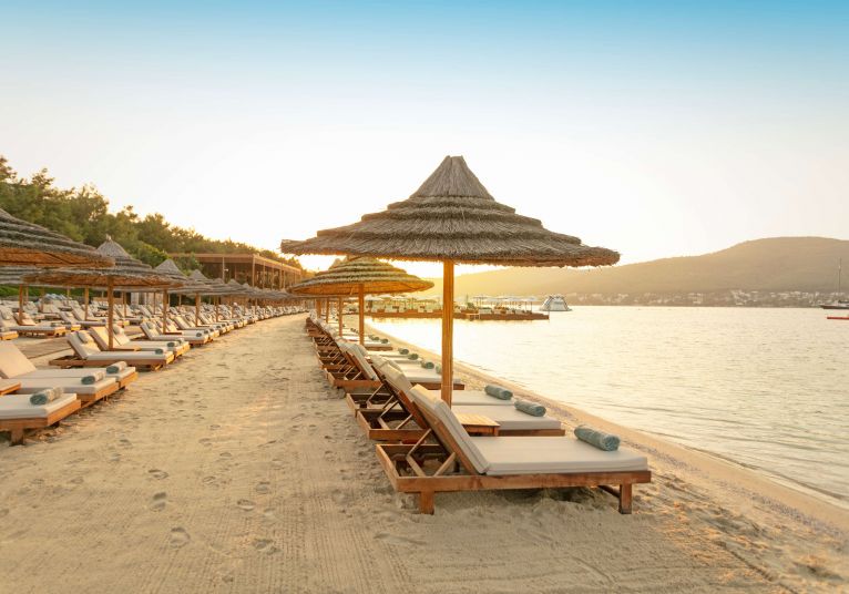 Собствен пясъчен плаж с бял пясък и дължина от 350 метра, притежател на "Син флаг" - чадъри и шезлонги на плажа и при басейна безплатно, плажни кърпи - безплатно.