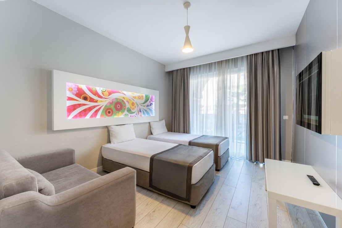 60 Garden Block Standard Room (изглед градина - 26 м2), 275 Standard Room (изглед градина, планина или страничен изглед море - 22 м2), 50 Standard Bunkbed Room (1 спалня и 2-етажно легло, изглед градина или планина - 26 м2), 3 Disabled Rooms (стаи за инвалиди, на първи етаж в основната сграда, гледка градина или планина - 22 м2), 32 Family Room (2 стаи със свързваща врата, 1 спалня и двуетажно легло, гледка градина - 33 м2), 10 Love Suit (спалня, тераса с джакузи, изглед басейн или частично море - 22 м2), 16 Swim -Up Room (спалня, тераса с директен достъп до общ басейн - 26 м2).
