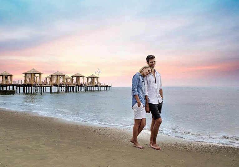 Собствен, пясъчно-чакълест, 3 платформи, притежаващ сертификат "Син флаг". Чадъри, шезлонги и плажни кърпи на плажа и при басейна – безплатно.