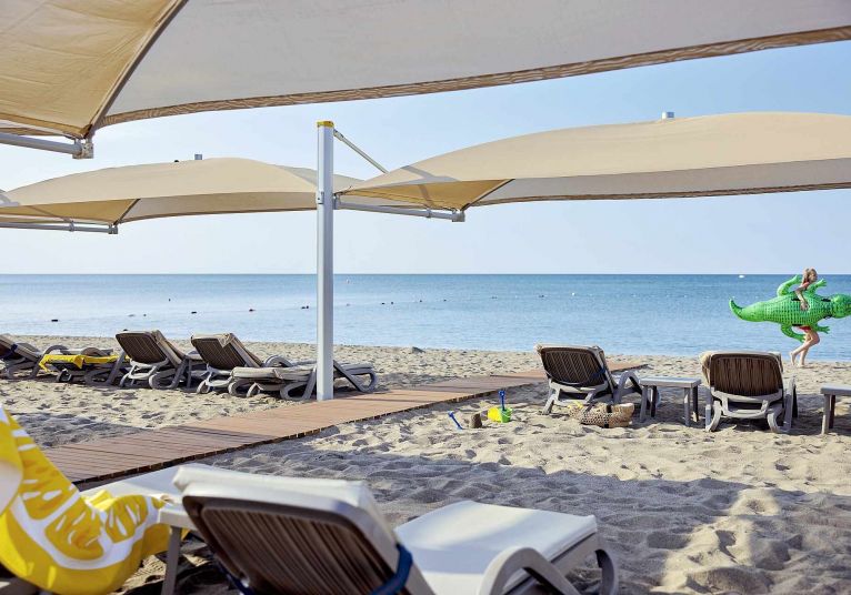 Собствен, пясъчен, с дължина на плажната ивица 250 м. и кей 400 м2. Чадъри, шезлонги и матраци на плажа и при басейна - безплатно. Плажни кърпи – безплатно.