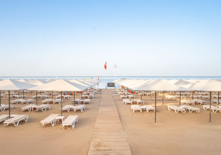 Собствен, пясъчен. Чадъри, шезлонги и плажни кърпи на плажа и при басейна - безплатно.