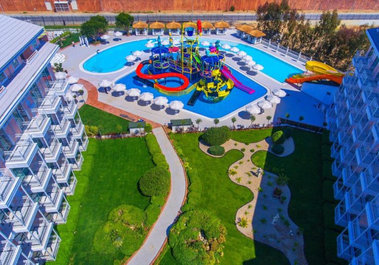 За децата: детски басейн, 5 детски пързалки, мини клуб (4-12), детегледачка (платено).