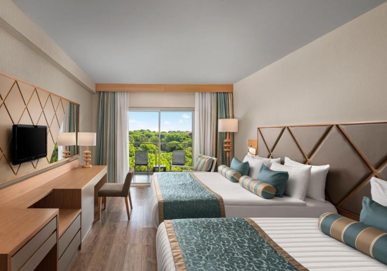 Стаи Main Building: 265 стандартни стаи, от които Standard room land view (изглед суша - 28м2),  Standard Room Side Sea View (изглед частично море - 28м2), 3 Handicap  room (изглед суша - 30 м2), 12 Executive room (изглед суша - 38 м2), 8 Family room (2 спални, всяка с двойно и единично легло, 2 бани, изглед суша - 56 м2), 10 Connection Family room (2 спални, една стая с 1 двойно и 1 единично легло, и една стая с 2 единични легла, 2 бани - 56 м2), 4 King Suite (2 спални, една с двойно легло и една с 2 единични легла, всекидневна, 2 бани, изглед море - 128 м2).