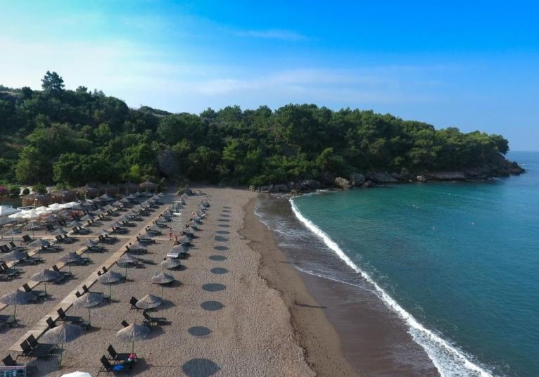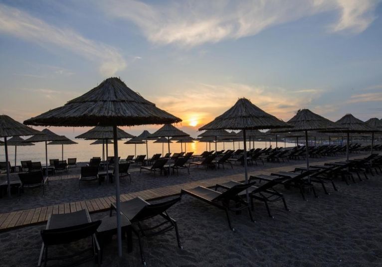Собствен, пясъчно-чакълест. Чадъри и шезлонги на плажа и басейна - безплатно.