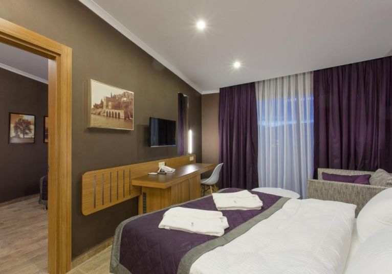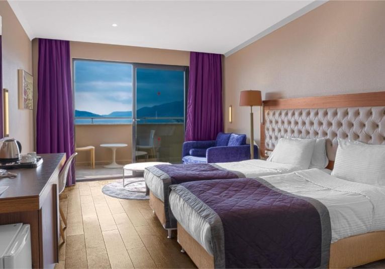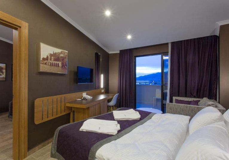 В стаите: Всички стаи са обзаведени в модерен стил. В цялата сграда всички стаи са с пълен или полуъглов изглед към морето и планината; електронна система за заключване на вратите и противопожарна аларма, мини бар, електрическа кана, комплект за чай и кафе, сателитен LCD телевизор, излъчване на музика (чрез телевизионни канали), душ и тоалетна, сешоар, директен телефон, климатик, двойни или френски легла, разтегателен диван за трети човек, сейф, балкон, аксесоари за баня (чехли, комплект за баня и др.), керамични подове, цветно дърво. Почистване на стаите - всеки ден, смяна на спално бельо хавлиени кърпи – 3 пъти седмично.