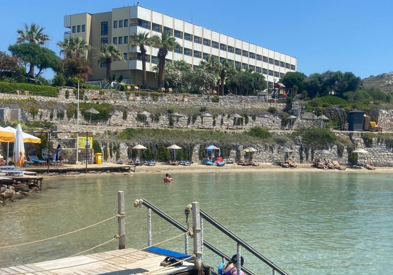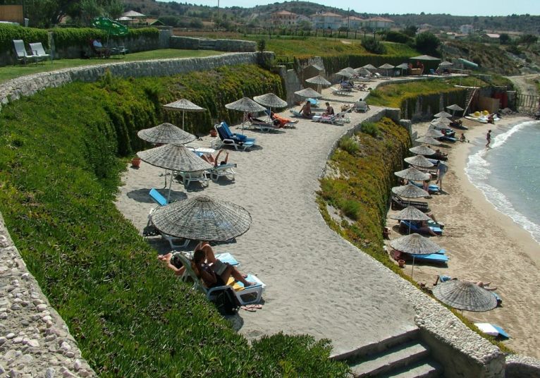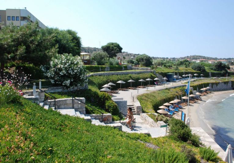 Плаж: дължина на плажната ивица 150 м. Разпределен на 3 нива – първите две нива са с фин пясък, а третото ниво е тревна площ . Морското дъно е с фин пясък плавно полегато. Плажът е удостоен със сертификат „Син флаг“. Има и платформа. Чадъри, шезлонги и матраци на плажа и при басейна- безплатно. Плажни кърпи - безплатно.