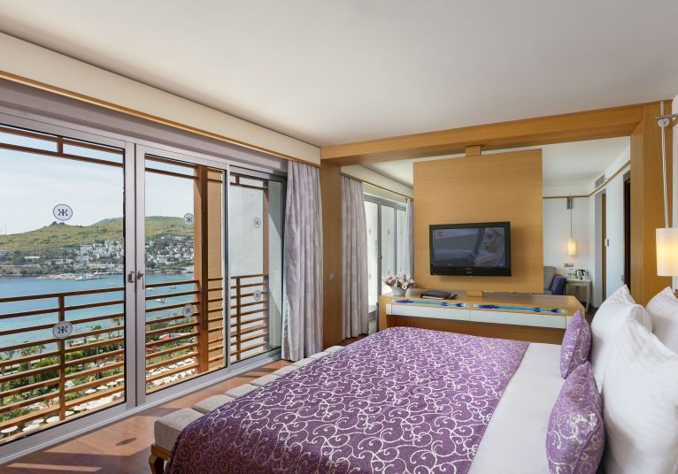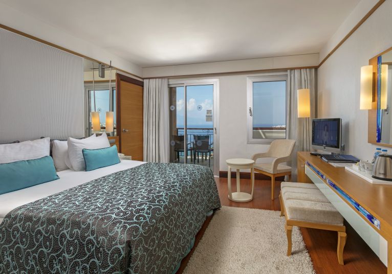 Стаи Main Building: Sea view room (спалня, баня, балкон - 27 м²), Deluxe Room Sea View (спалня, баня, балкон - 36 м²), Standard large room sea view (спалня със зона за сядане, баня, балкон - 34 м²), Junior suite room sea view (спалня със зона за сядане, баня, балкон - 56 м²),  Family suite room sea view (2 спални, баня, тераса - 79 м²), Connection room sea view (2 спални с топла връзка, баня, тераса - 54 м²), Superior Suite Swim Up (2-етажна вила с 2 спални, с директен достъп до общ басейн, баня - 180 м²).