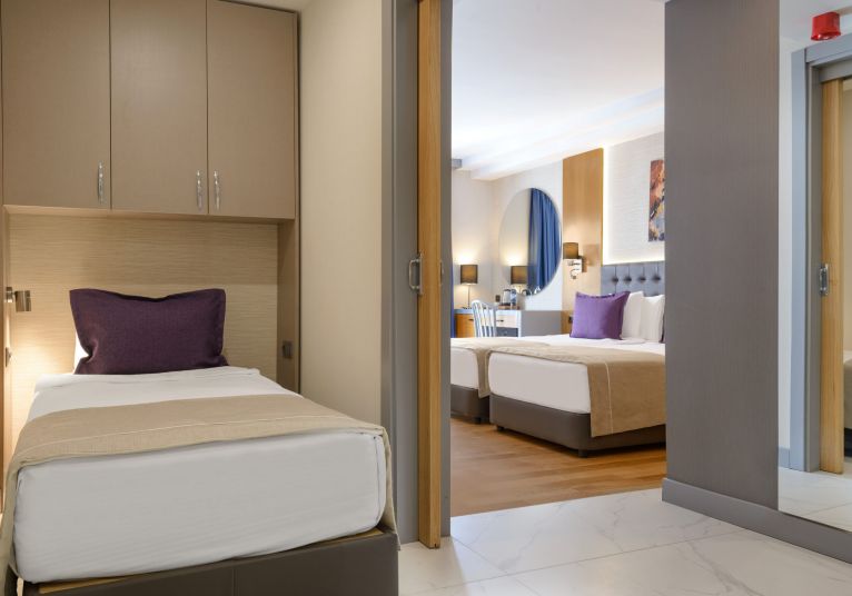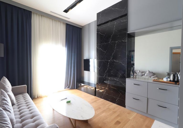 Стаи Club Room Land View (спалня, баня, изглед суша,на 2-та сграда - 22 м²), Club Room Sea View (спалня, баня, изглед море, на 2-та сграда - 22 м²), Superior Room Sea View  (1 спалня, хол, 1 баня, на 2-та сграда - 91 м²), Deluxe Room Garden View (спалня, баня, изглед суша, в основната сграда - 25м²), Deluxe Room Sea View  (спалня, баня, изглед море, в основната сграда - 25м²), Deluxe Suite (спалня, хол, баня -  56 м²).