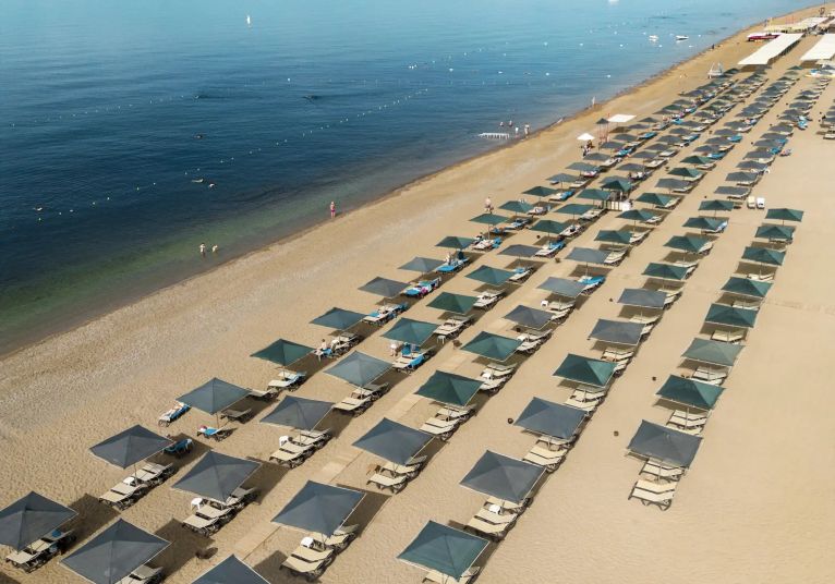 Собствен, пясъчно - чакълест. Чадъри, шезлонги и плажни кърпи на плажа и при басейна – безплатно.