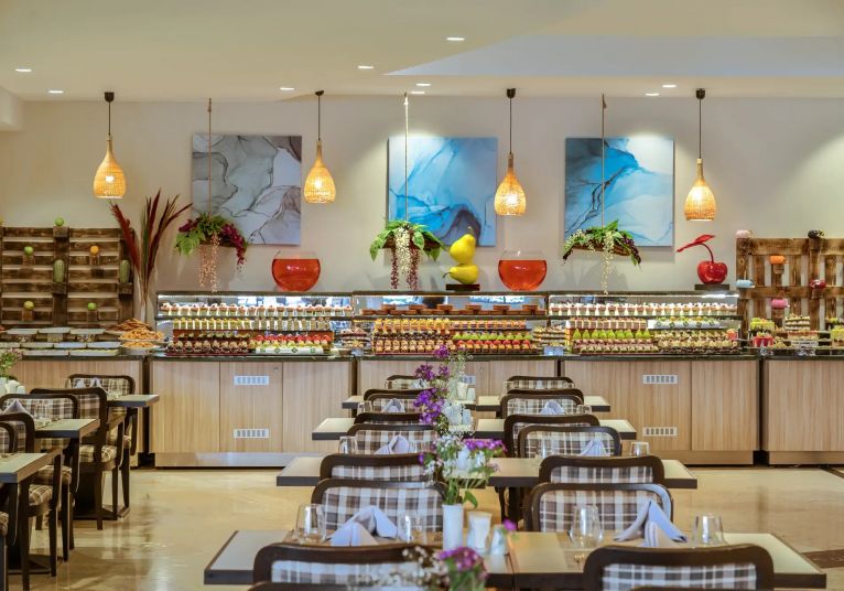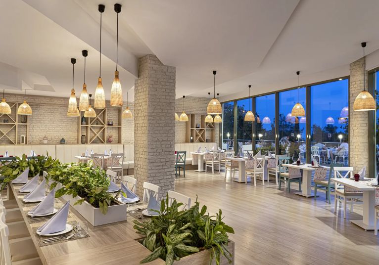 Основен ресторант, 3 а-ла-карт ресторанта (италиански, гръцки, барбекю - 1 безплатно посещение на 1 от ресторантите при минимум 7 нощувки, с предварителна резервация), 4 бара (1 от които 24-часа), 2 открити и 1 закрит басейн, 2 водни пързалки, СПА център, дискотека, магазини, конферентна зала, паркинг.
