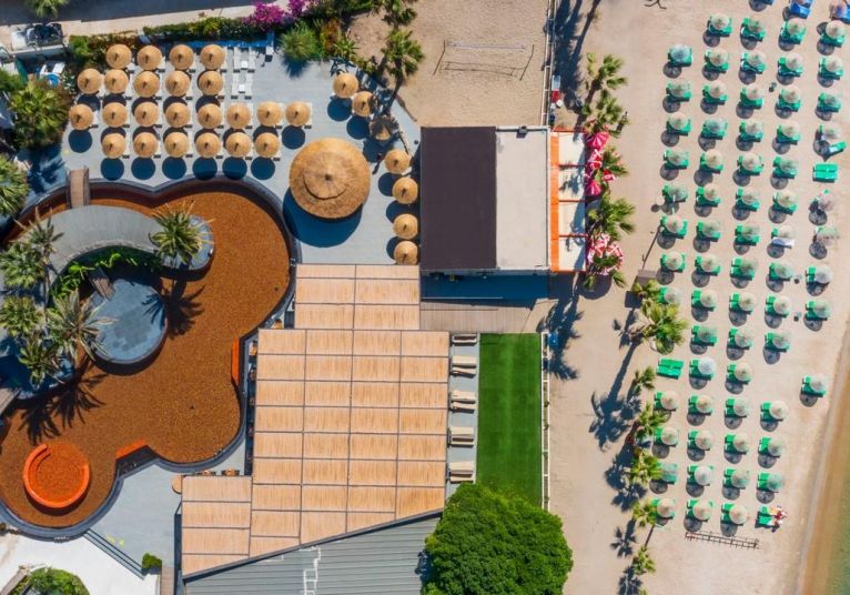 Собствен, пясъчен. Чадъри и шезлонги при басейна и на плажа - безплатно. Плажни кърпи срещу депозит.