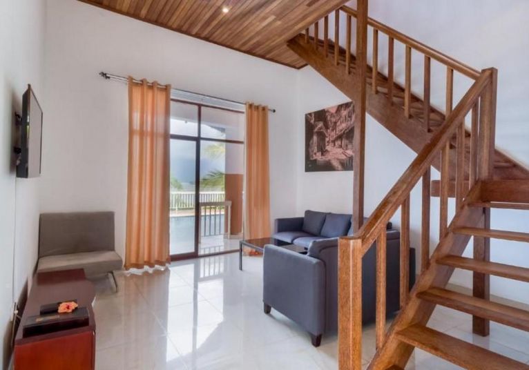 Дуплекс стая с изглед към басейна – 80 м2, максимално настаняване 2 възрастни: голяма спалня, кът за сядане, кухненски бокс снабден с микровълнова фурна, електрическа кана, частен басейн и балкон.