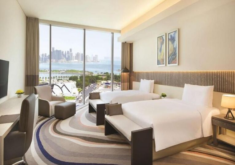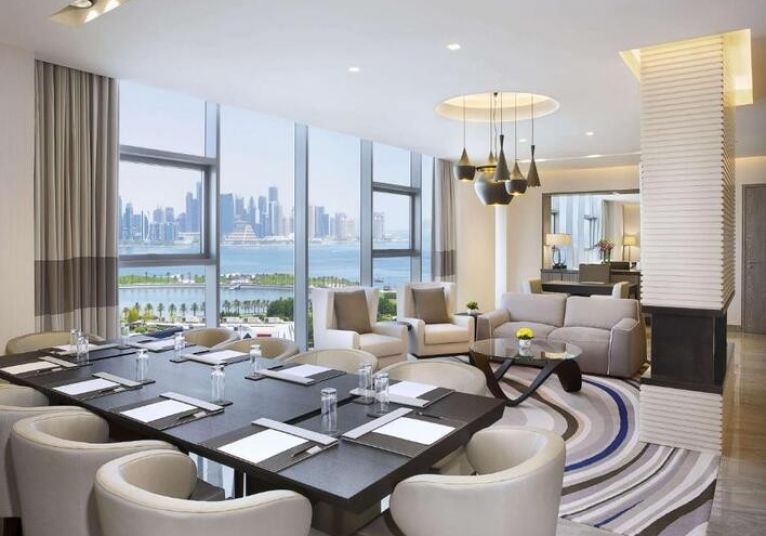 Луксът среща комфорта в този живописен Джуниър Суит с площ от 70 кв. м. / 753 кв. фута с морски изглед, с прозорци от пода до тавана, разкриващи гледка към Арабския залив и силуета на крайбрежната алея на Доха.