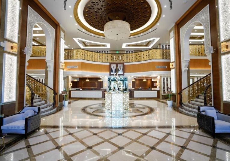 Хотелът сервира близкоизточна и местна кухня за обяд и вечеря. Опциите за закуска включват континентална, американска, шведска маса и пълна английска/ирландска закуска, включваща топли ястия, пресни сладкиши и други.
