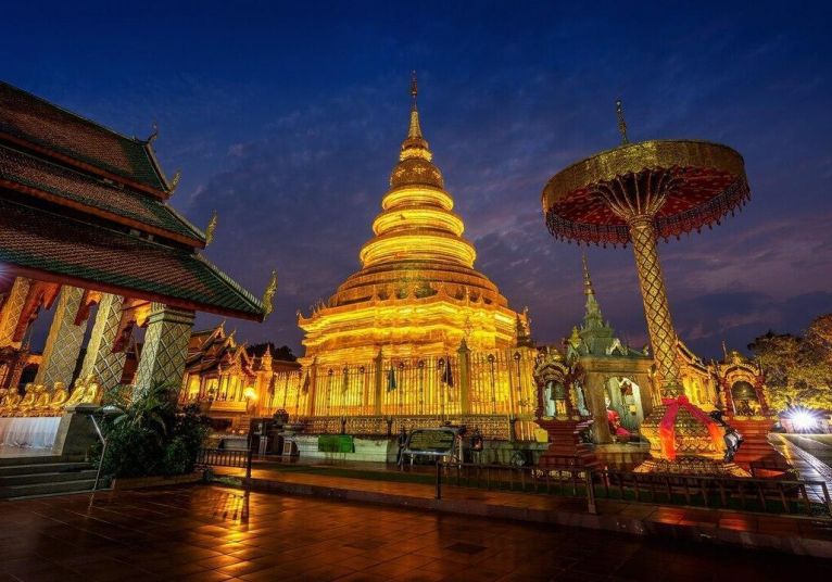 С история, датираща от IX век, храмът впечатлява с изящество и хармония. Ще се насладим на величествени статуи на Буда, изкусно орнаментирани фасади и бляскави ступи, сред които се откроява 46-метровото златно чеди, изградено в стил Лана - символ на благоденствие и духовна сила. Ще видим също и 21-метровото чеди в стил Харипунчай, което свидетелства за древната история на града като столица на едноименната монска държава.